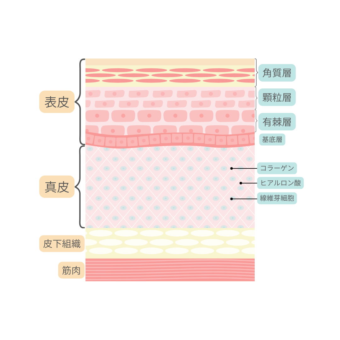 肌は大きく分けて、「表皮」、「真皮」、「皮下組織」の3層から成り立っています。